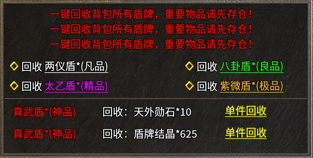从角色的界面就能看到,《骏风古龙传奇》比普通的复古版本要多出盾牌、印记和配饰的栏位。其中最核心的就是盾牌,游戏中有凡品、良品、精品、优品和神品5个品级的盾牌,通过完成锻造、签到、升级等奖励就能获得盾牌宝盒,随机开出一个盾牌。