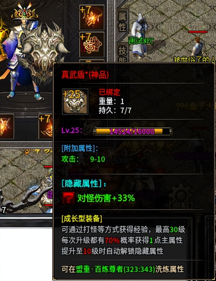 这个盾牌有一种“拟人感”,因为玩家需要用刷怪获取的经验来注入它,给它升级,最高可以升到30级。每次升级都有概率获得1点主属性,升到10级时还能自动解锁隐藏属性,越是高品级的盾牌成长和解锁的属性能力也越高,同时盾牌还能合成、分解和重铸,直到玩家获得满意的高属性加成为止。
