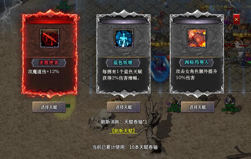 每次解锁天赋时都可以随机抽取3种天赋属性,从低到高包括蓝色、橙色和红色3个品级,其中红色天赋属于传说级,抽取概率仅有0.5%。如果对自己抽到的蓝色天赋不太满意,玩家还可以通过天赋卷轴来刷新重选,每使用10次天赋卷轴必然会出现橙色天赋,同时红色天赋的出现概率也会提高到20%。不难想象,在保底和RP爆发的双重加持下,玩家会把战力提高多少个台阶。