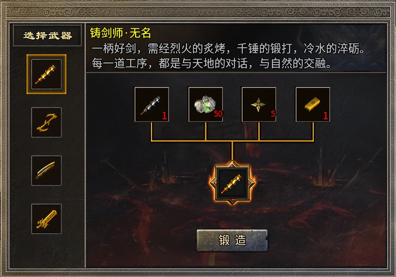 前面提到的装备系统中,在武器上并未给玩家设置天花板,《骏风古龙传奇》中加入了一位NPC铸剑师,玩家能在他那里打造出终极黄金武器,像什么耳熟能详的裁决、怒斩、屠龙、开天都名列其中。