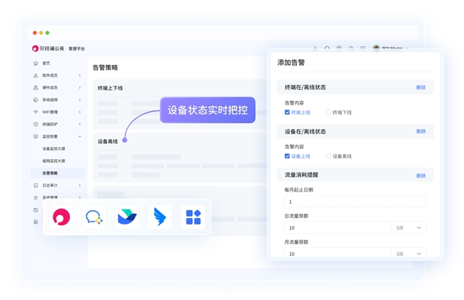 另一方面,贝锐蒲公英依托云管理平台,可实时监测设备与链路状态,根据设定的告警策略,第一时间记录并推送异常信息,支持通知至蒲公英管理App或企业常用的第三方IM工具,如企业微信、钉钉、飞书等。通过云端远程管理,网络管理员无需前往现场,即可快速、及时了解网络情况,随时随地进行设备调试,高效处理问题。
